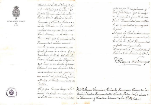Real Orden de 5 de junio de 1902, concediendo el real privilegio, que se conserva en el Archivo de la Hermandad. Dicha Real Orden viene firmada por el Mayordomo Mayor de SM, el Duque de Sotomayor.