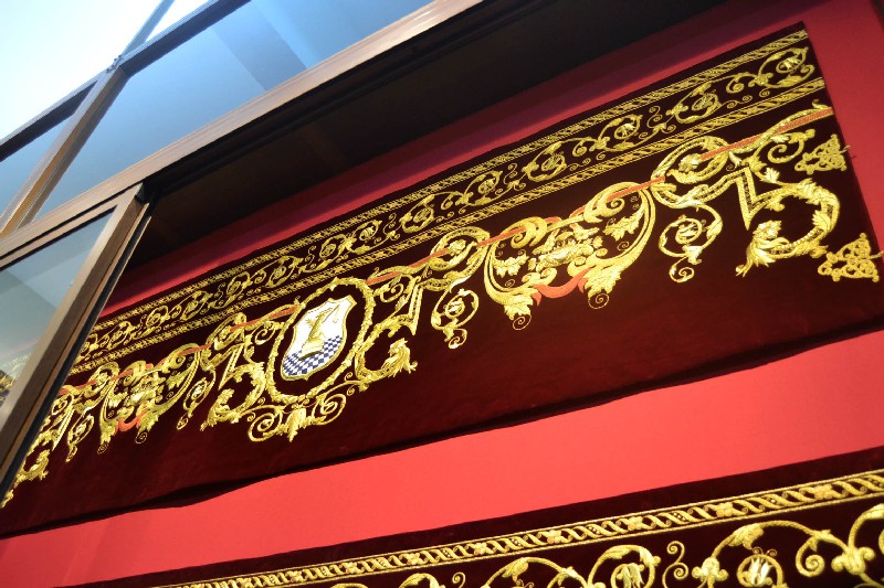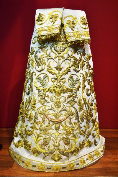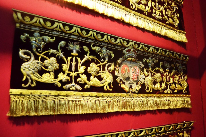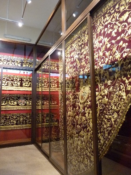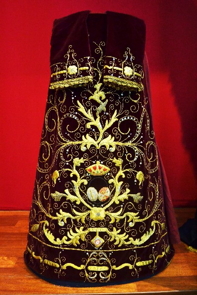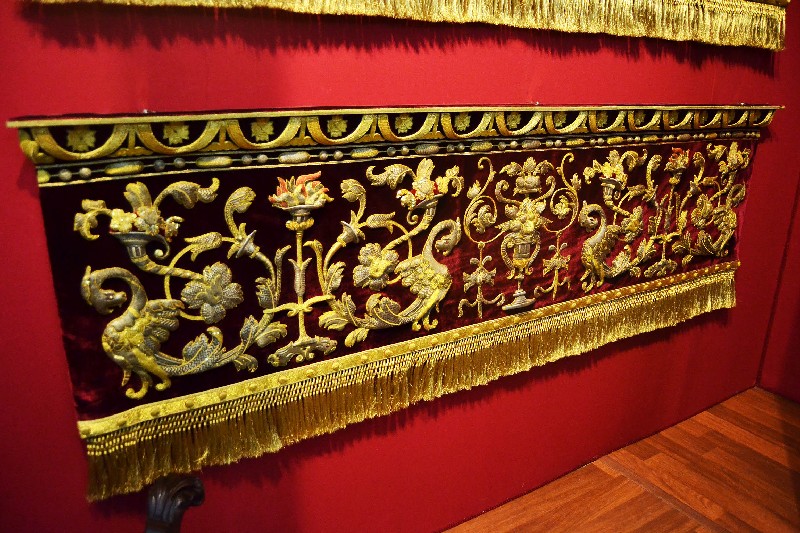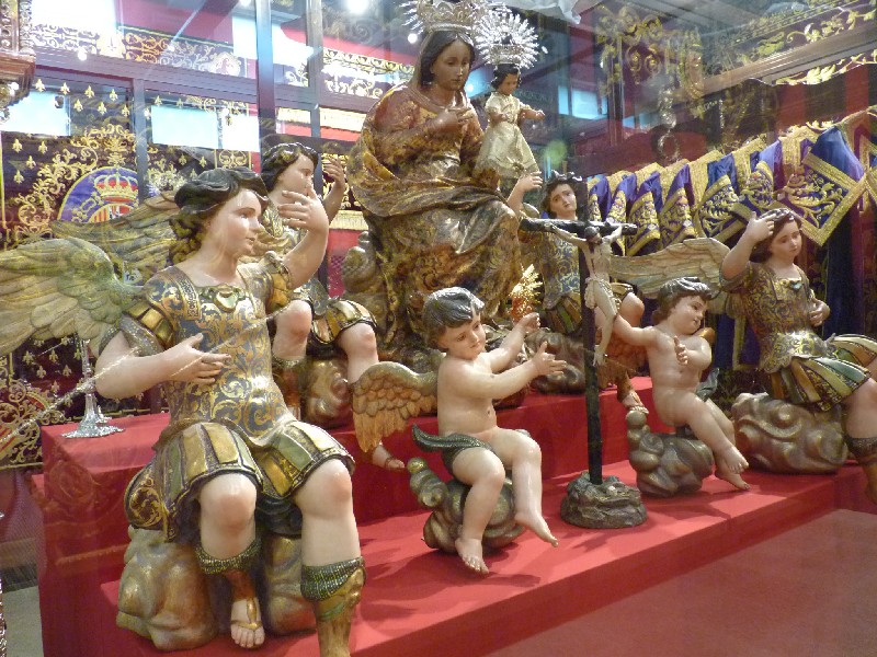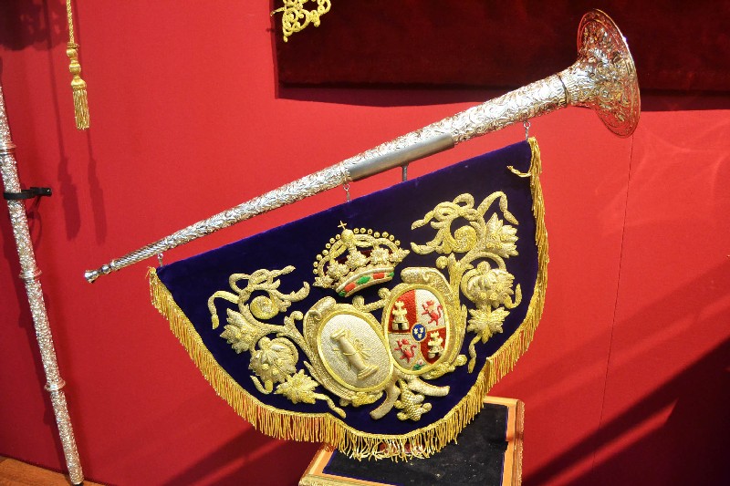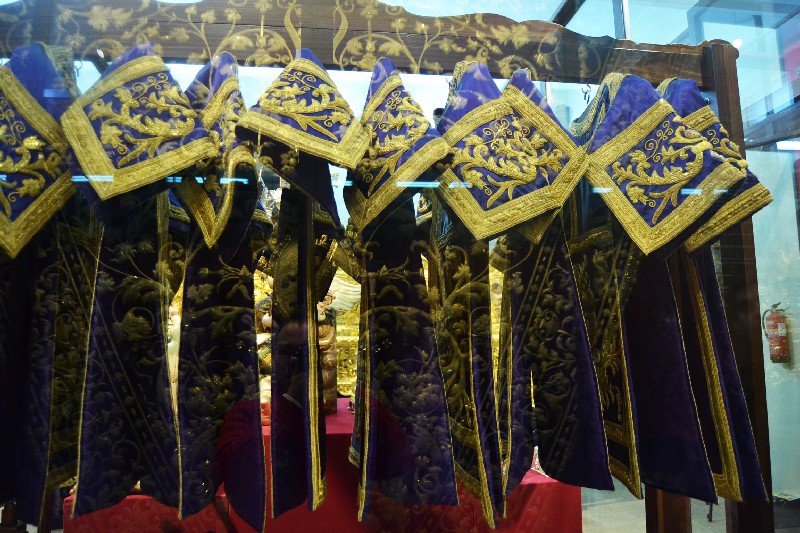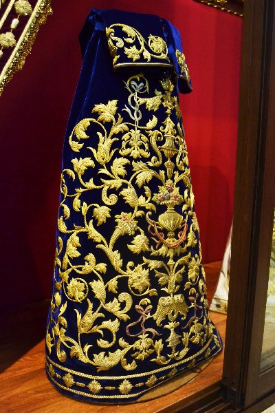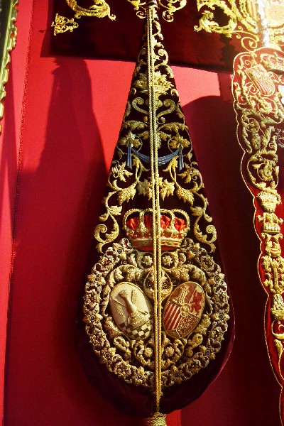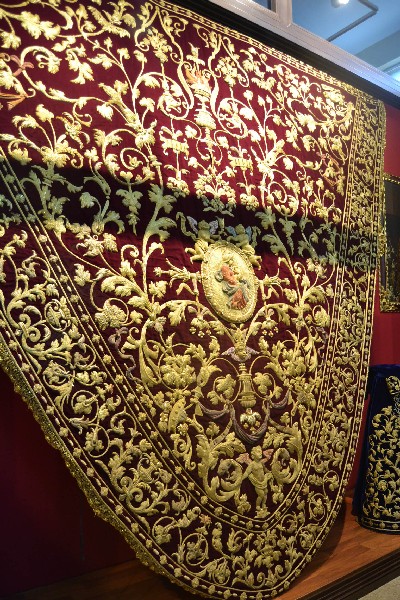 Una gran parte de las piezas expuestas son textiles bordados, principalmente procedentes del paso de la Virgen de la Victoria, diseñado entre 1892 y 1928; así como el juego de insignias de 1928 del Taller de José Caro; las sayas de Emilia Salvador Ybarra (negra) de 1887-1888, aún en puro estilo romántico; la de Juan Manuel Rodríguez Ojeda (tisú de plata) probablemente de 1905 y la de Talleres Santa Bárbara (azul) de 1985, estas dos últimas basadas en la estructura ornamental del manto; y el conjunto de dalmáticas y capa pluvial bordados en oro para el cuerpo litúrgico de la cofradía.