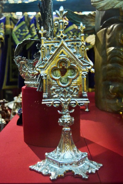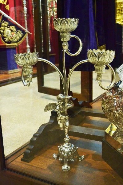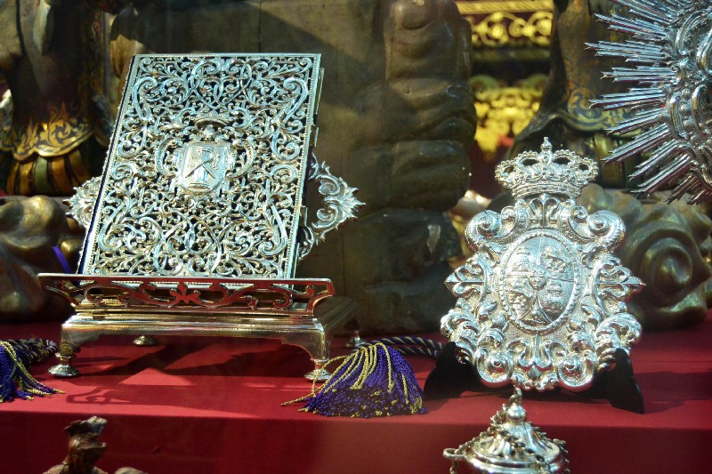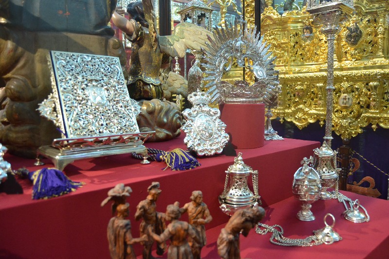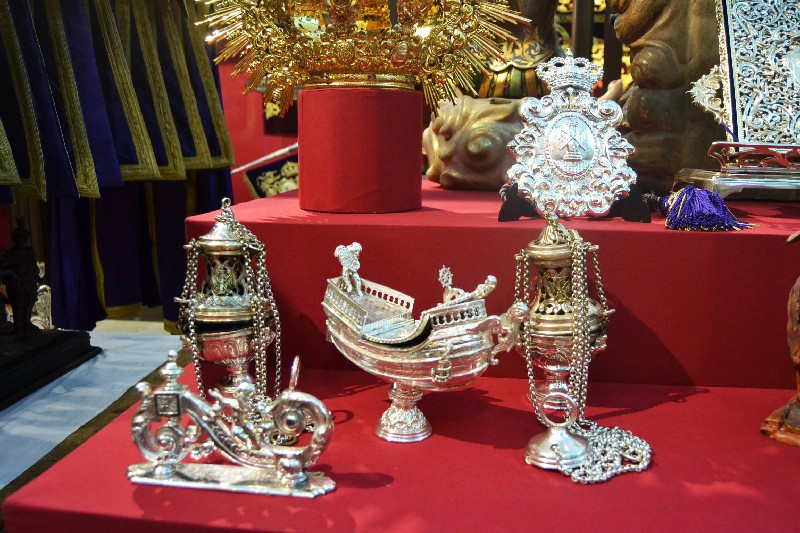Entre las piezas de orfebrería seleccionadas para su exposición sobresalen la peana y respiraderos del paso de la Virgen de la Victoria, diseñadas por Pedro Domínguez López y realizadas por Cristóbal Ortega (1895-1896), siendo los respiraderos los más antiguos conservados de la Semana Santa de Sevilla, así como la corona de salida realizada por Seco Velasco en 1968 y el nuevo libro de reglas realizado por Hijos de Juan Fernández inspirándose en el antiguo (1790), obra del platero Joseph Blanco. También incluye los varales (1945) y candelabros de cola (1955) del paso de la Virgen, realizados por Fernando Cruz Suárez.