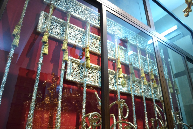 La Sala dispone de vitrinas laterales en la longitud de tres de las cuatro paredes de la sala, así como una vitrina exenta, formando un perfecto recorrido en la sala en torno al patrimonio expuesto. El espacio expositivo consta de cinco vitrinas, que ocupan un total de 61 metros cuadrados de distribución, y una volumetría de 116 metros cúbicos en los que se reparte la mayor parte del patrimonio mueble de la Hermandad. Las vitrinas cierran herméticamente y se ha realizado en ellas un doble fondo desde el suelo hasta el techo, formando una cámara de aire que evita que estén pegadas a la pared y al suelo, actuando como aislante, no siendo afectadas por las oscilaciones térmicas y de humedad que puedan transmitir; ello unido a que se trata de que el aire circule constantemente por estas cámaras independientes al interior de las vitrinas.
